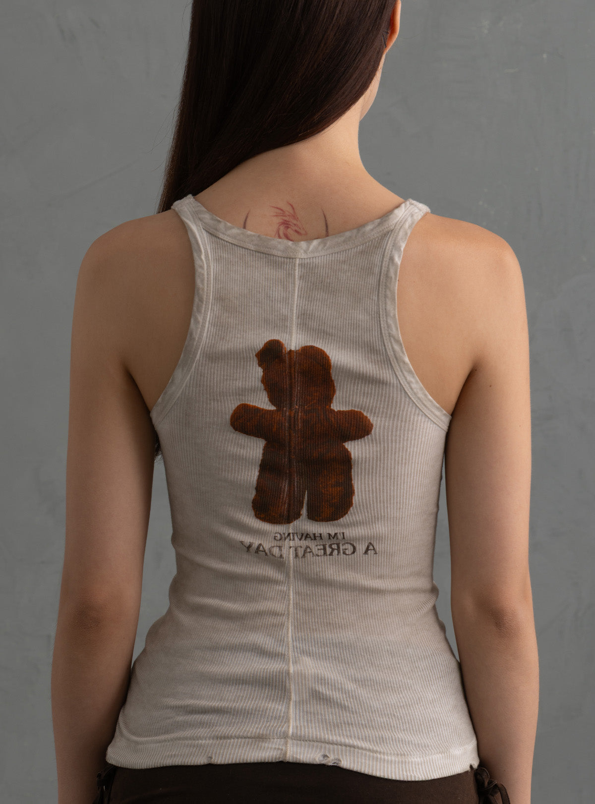 Super soft ribbed tank made in LA with a disheveled bear who’s been through it. Front and back print with a weathered mineral wash.