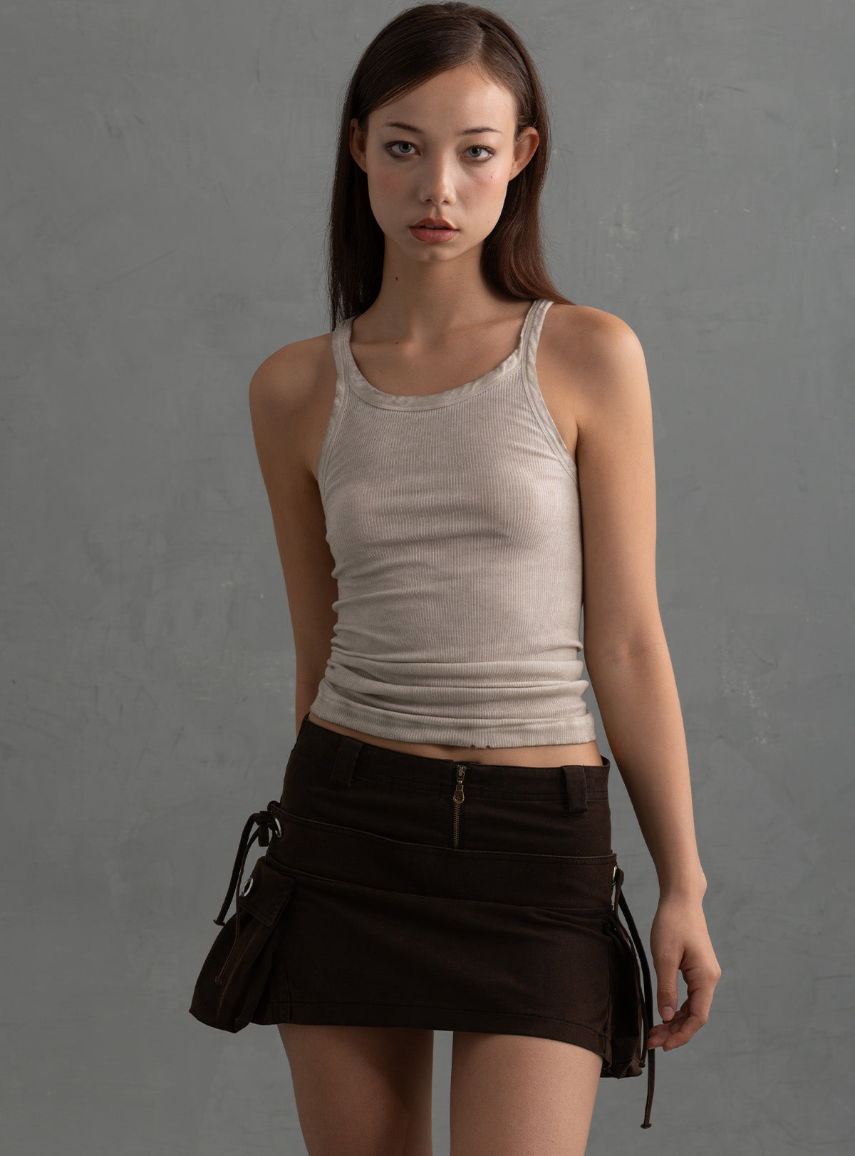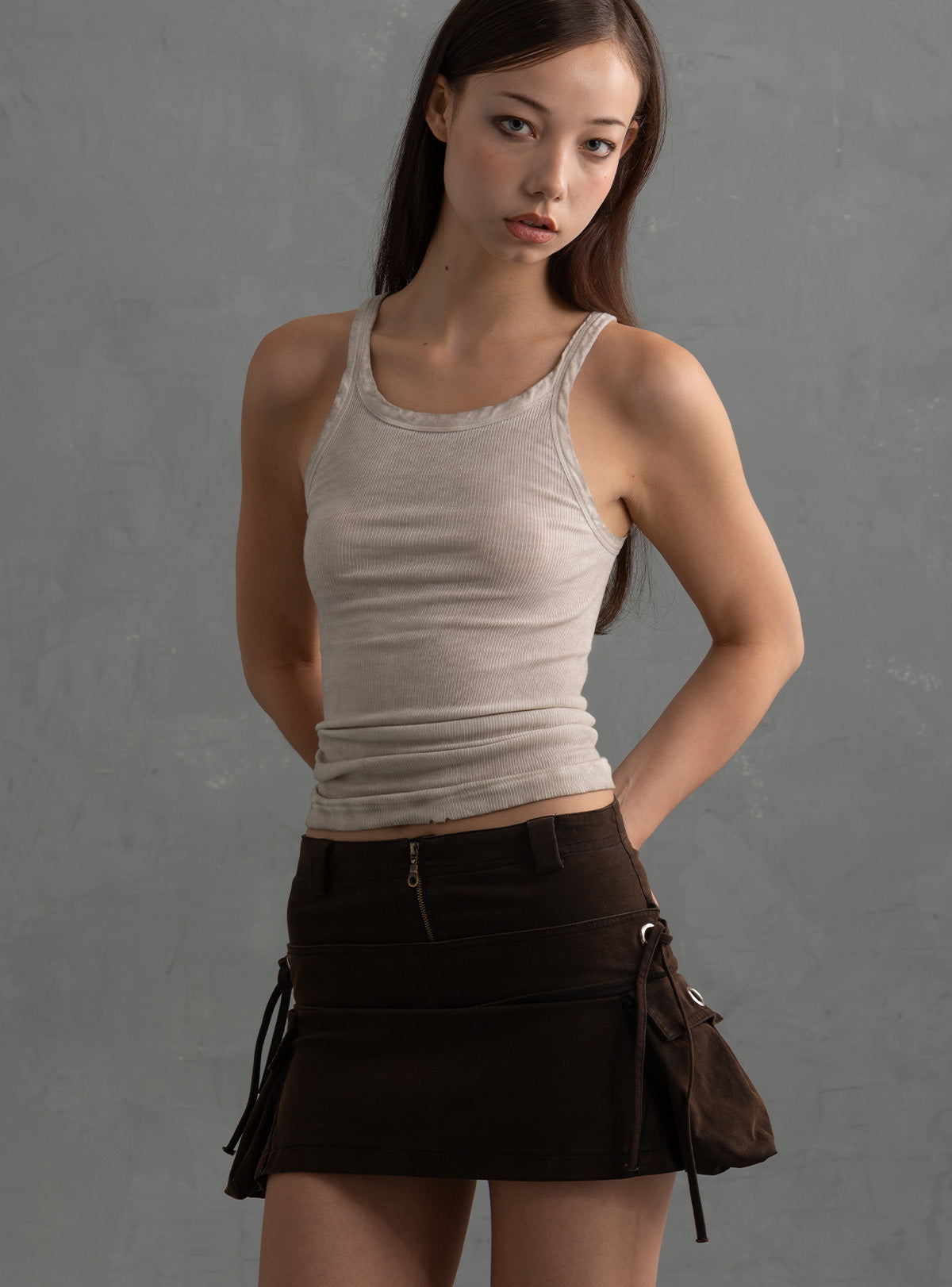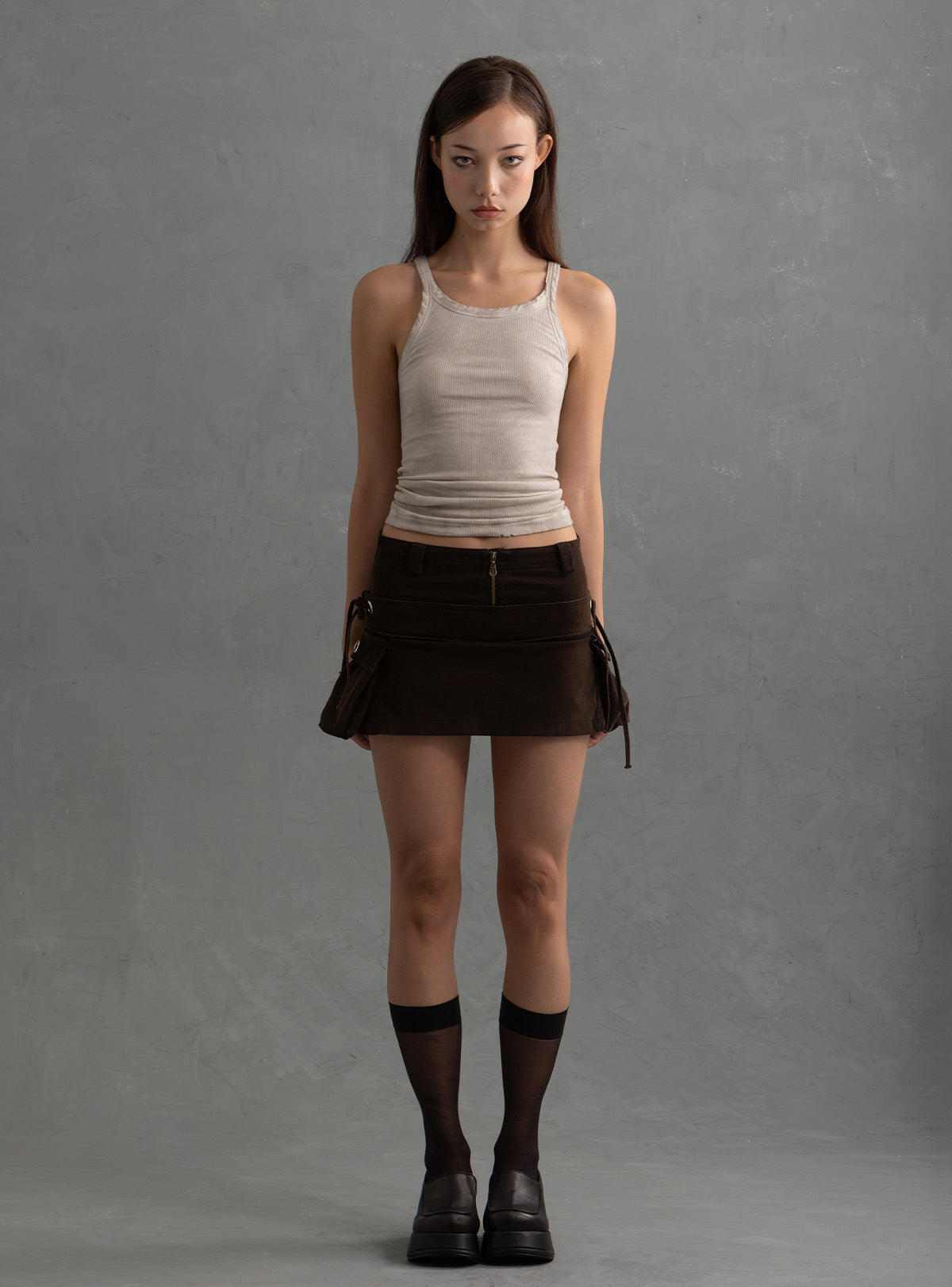 Subtle utilitarian mini skirt featuring a double waist front zip closure in brass and cargo pockets that tie through chunky nickel eyelets. Offered in a stone-washed espresso brown stretch denim.