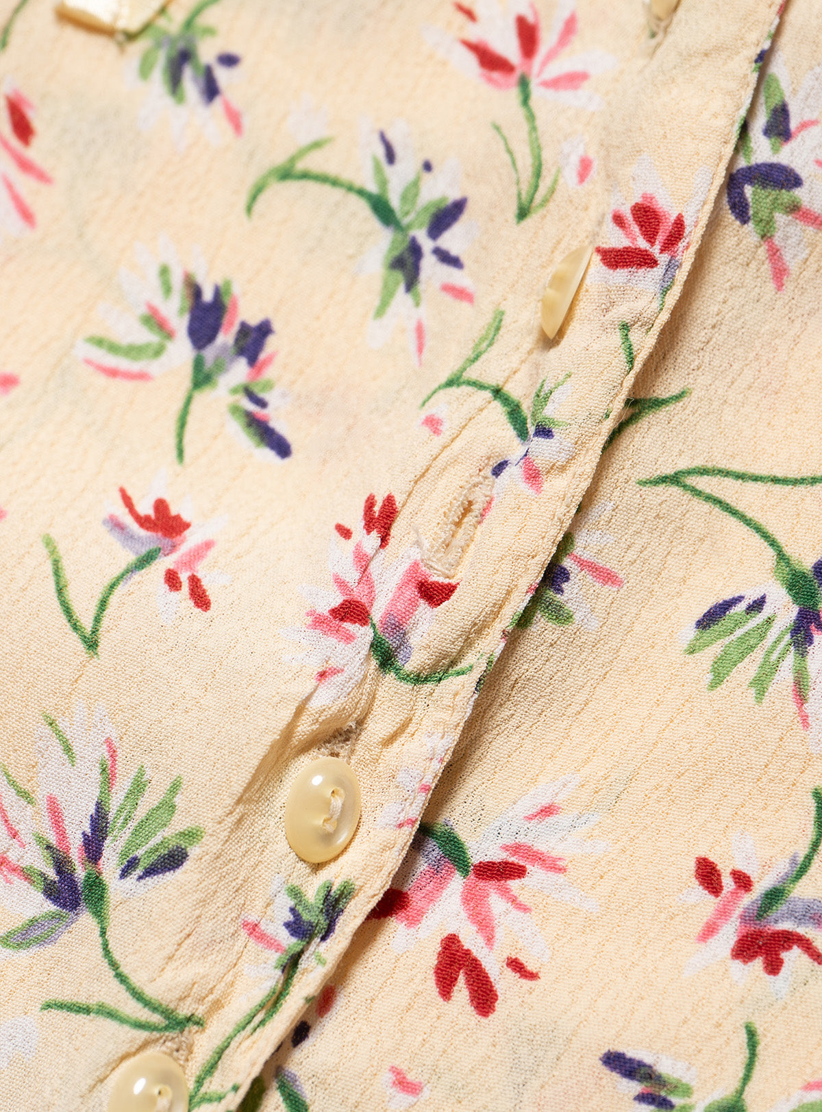 90's floral print, gauzy fabric, mini dress with satin tie detailing and open button front. Would look perfect with a fuzzy cropped cardigan.