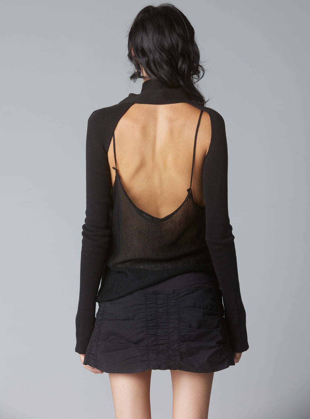 Knit cotton shrug with elongated sleeves and a mock turtleneck. Tie detail at the collar for a wrapped scarf effect.