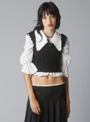 Oversized collar, flowy, mini button-down blouse with ruffled sleeves and lacy detailing at the hems.