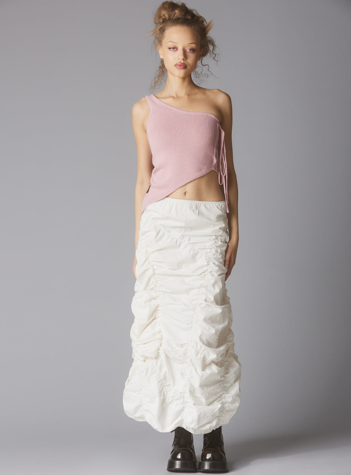 One-shoulder asymmetrical top with added adjustable ruching detailing.