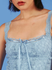 Lacy bustier-style cami with sweet satin bow detail across the neckline. Comes in multiple colorways.