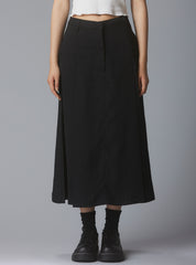 Pleated mid-rise maxi skirt with side welt pockets, belt loops, button and zipper front closure.