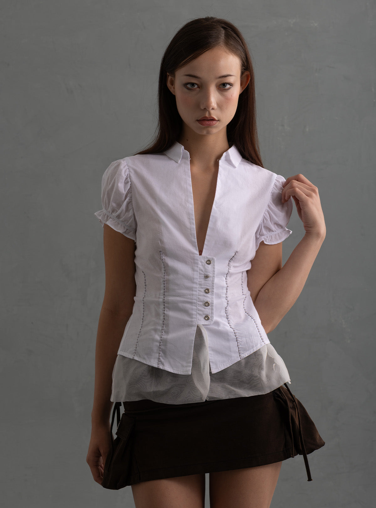 Vintage archive-inspired fused with Victorian romance style top featuring a fitted top made from 100% Cotton with an underneath layer of 100% Silk gauze peeking through, corsetry stitch detailing, puff sleeves and button closure. Above the button placket features 2 hook and eye closures for a more prim high neck look.  Ethereal, structured-yet-delicate Lolita.