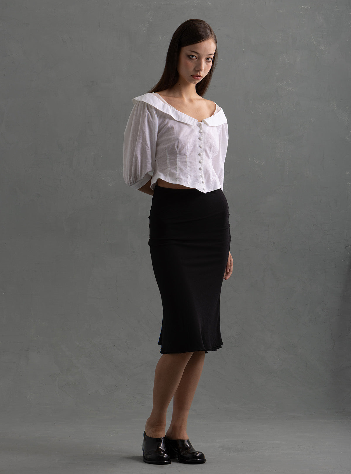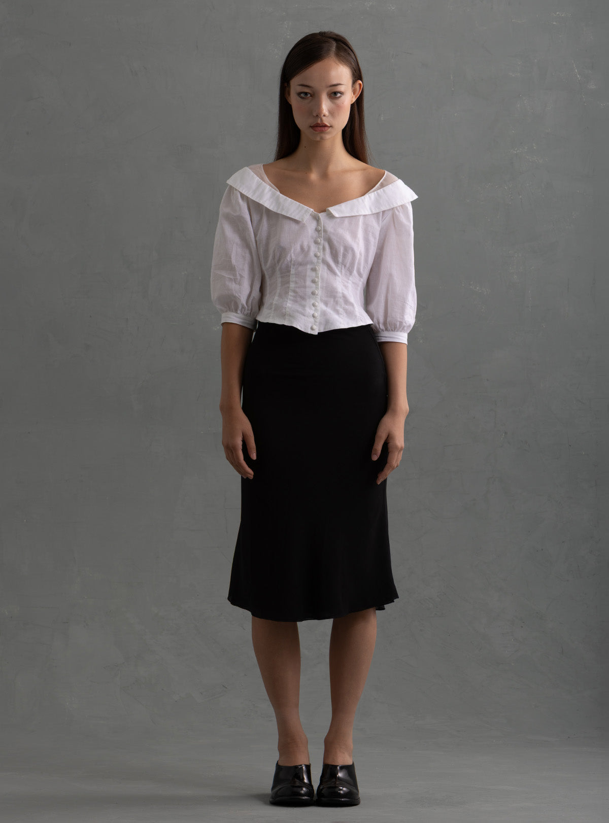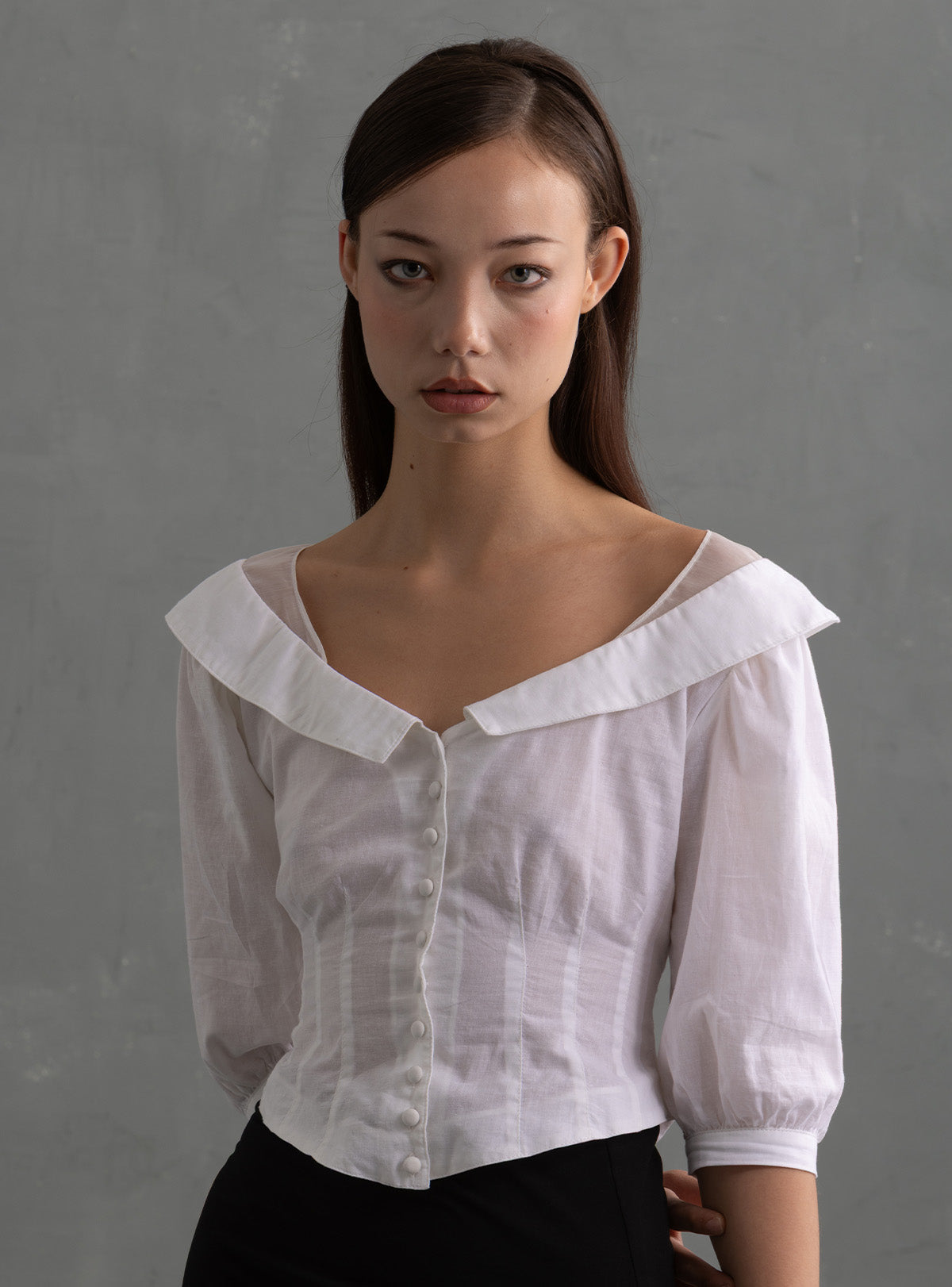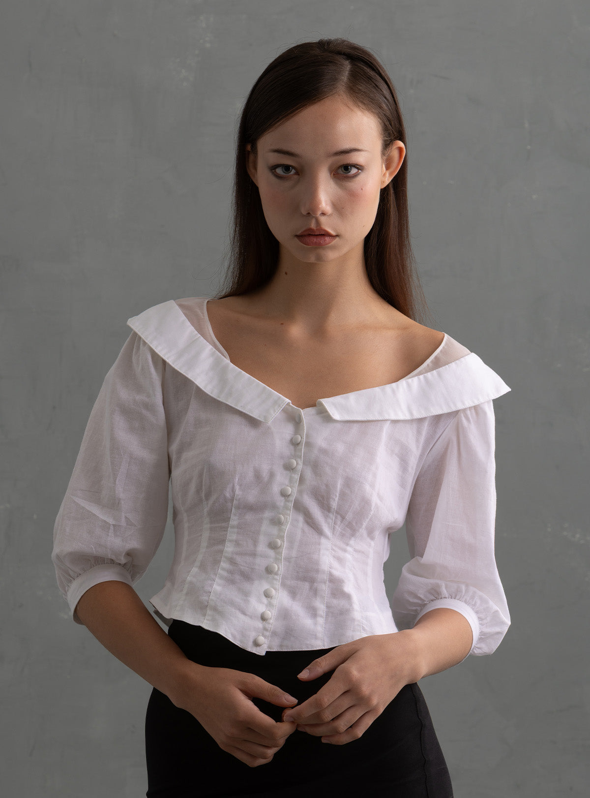 A delicate structured cotton/linen blouse featuring a sculpted off-shoulder neckline, 3/4 subtle puff sleeves, fabric covered button front, and corset-style seaming. The sheer gauze inset supports the structure of the silhouette. Elevated essential with romantic tailoring.